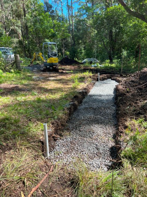 As groundwater accumulates in the surrounding soil, it naturally flows into the gravel trench, enters the perforated pipe, and is redirected to a designated safe discharge area. This system operates efficiently below ground level and does not rely on visible grates or channels, making it particularly beneficial in clay-heavy soils, which are common in Wollongong and the broader Illawarra region.