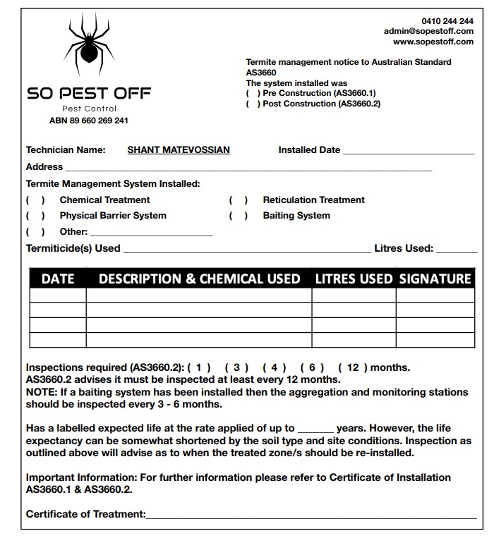 • A certificate outlining the installed termite management system